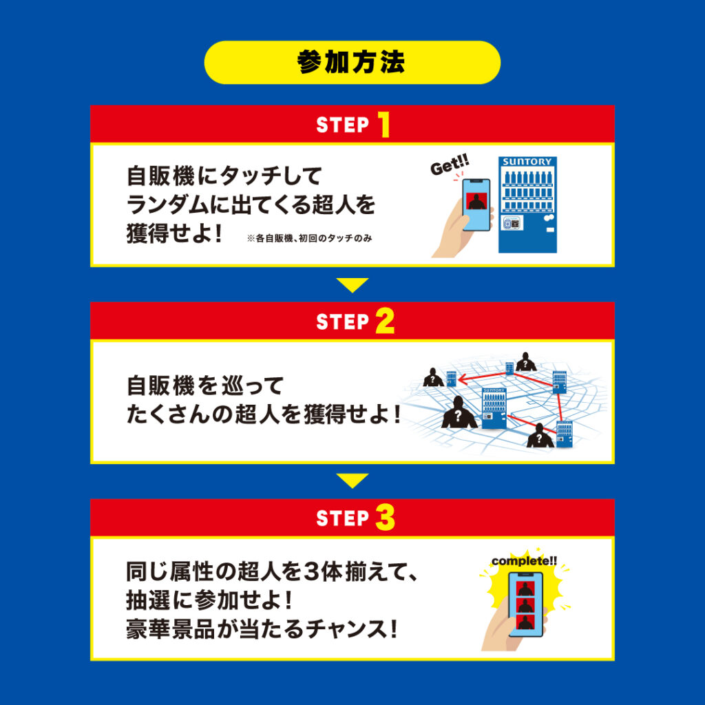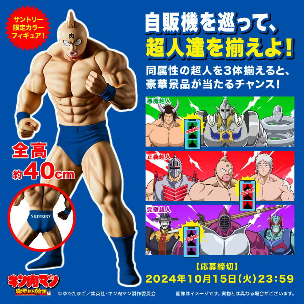 2024.09.27 未分類 キン肉マン×サントリー自販機コラボ開催中! 限定50名様にサントリー自販機カラーのキン肉スグルフィギュアが当たります! 参加方法は、Touch! SUNTORY対象自販機に”タッチ”するだけ! 自販機タッチで超人を獲得し同じ属性の超人を3体揃えると抽選に参加できます。 詳細はこちら BACK